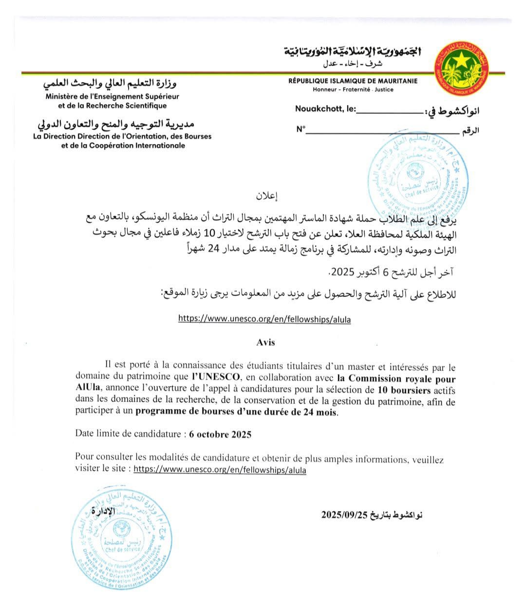 أعلنت وزارة التعليم العالي والبحث العلمي في موريتانيا عن فتح باب الترشح لبرنامج منح بحثية، تنظمه منظمة اليونسكو بالتعاون مع الهيئة الملكية لمحافظة العلا. ويستهدف البرنامج الطلبة الحاصلين على شهادة الماستر والمهتمين بمجال التراث.