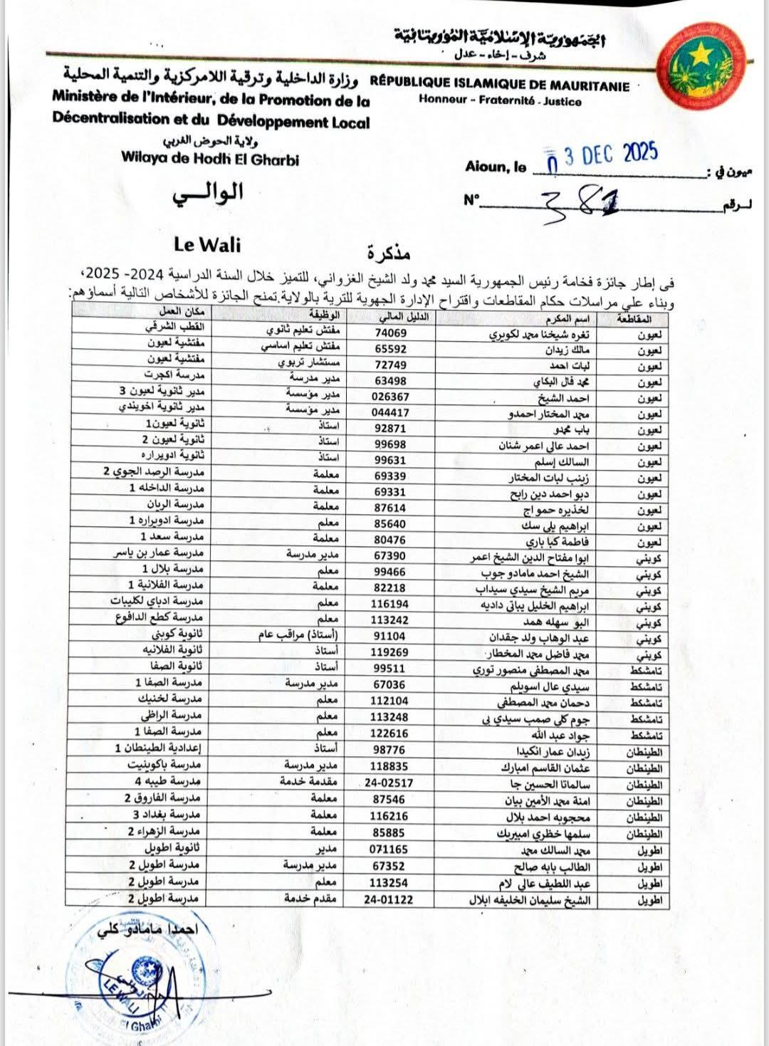 أفرجت الإدارة الجهوية للتربية وإصلاح النظام التعليمي بولاية الحوض الغربي عن لائحة المكرمين الفائزين بجائزة رئيس الجمهورية للتميز للعام الدراسي 2025- 2025.