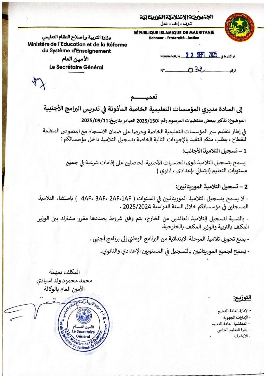 أصدرت وزارة التهذيب الوطني وإصلاح النظام التعليمي، يوم الثلاثاء 23 سبتمبر 2025، تعميمًا موجهاً إلى مديري المؤسسات التعليمية الخاصة المأذونة في تدريس البرامج الأجنبية، يتضمن ضوابط جديدة لتنظيم تسجيل التلاميذ الأجانب والموريتانيين.